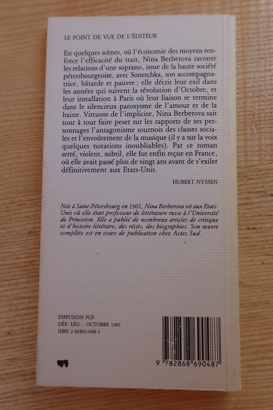 Pétersbourg, 1919. La neige. Le silence. Le froid et la faim. Les pieds qu’on n’a pas lavés depuis un mois. Les fenêtres bouchées avec des chiffons… J’entre dans l’immeuble. Il fait chaud ! Des tapis, des rideaux, un coffret de cigarettes précieuses. Un chat bleu fumé. Et une femme. Belle, grande, robuste. Des cheveux noirs bien coiffés. Le visage rond et beau, les yeux noirs. Tout en elle dit l’équilibre mystérieux, beau et triomphant. Elle chante et je serai son accompagnatrice. C’est cette vie que je vais m’acharner à détruire. Parce qu’elle est belle, talentueuse, et que je ne suis rien. Parce qu’elle est forte et qu’elle rayonne. Parce qu’elle m’aime et que, moi, je ne comprends même pas ce que cela veut dire..
